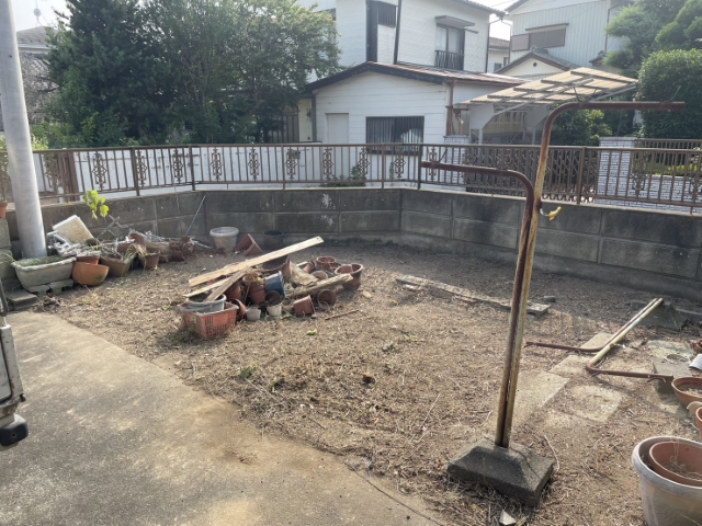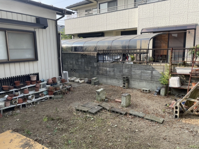 通路はふさがれ、物干し場にも草が迫り、鉢やブロックが点在。ご近所の目も気になるところです。空き家管理では、まず「見た目の安心感」と「再発しにくさ」を同時に整えることが大切です。