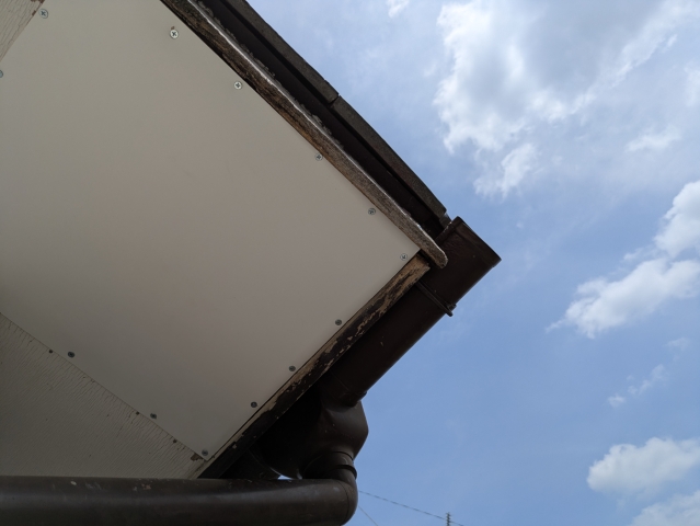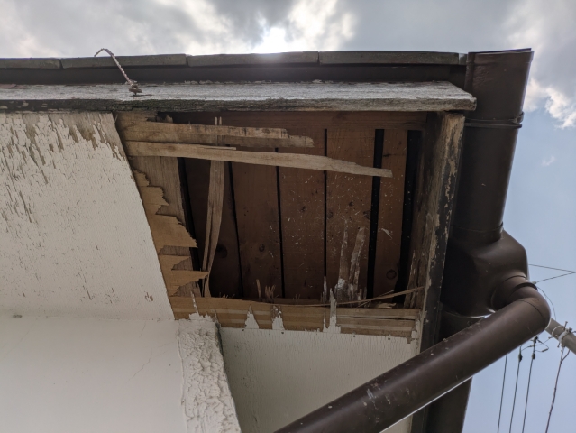 経年劣化と雨水の回り込みでベニヤが剥がれ、下地が露出。放置すると小動物の侵入や、強風時に破片が落ちる危険もあります。早めの手当てが肝心です。