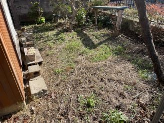 お庭には、前回の草刈りからしばらく時間が経っていたこともあり、地面には枯れ草が厚く残り、その合間から新しい雑草が顔を出している状態でした。