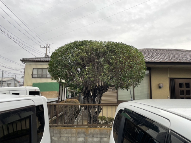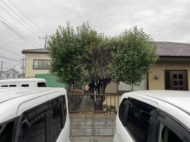 お客様の駐車スペースとお家の間に植えられた庭木は、長年そのまま伸びてしまい、背丈も横幅もかなりボリュームのある状態でした。