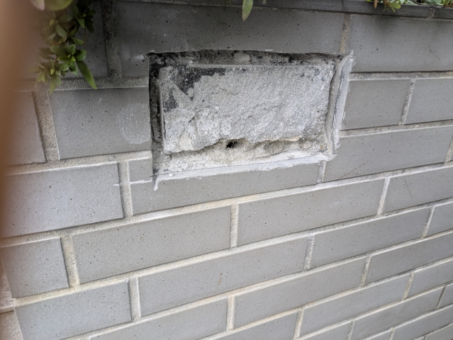 表札の周囲に硬い充填材が回っていて、簡単には動かない状態。そこで、ブロックの角を傷めないように養生をして、力任せに引っ張らず「少しずつ、面で剥がす」イメージで作業を進めました。
