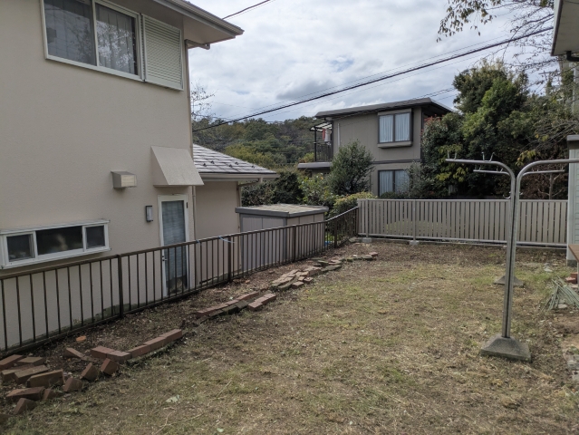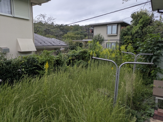 お庭は建物の脇にまとまったスペースがあり、物干し周りも含めて草がしっかり伸びている状態。