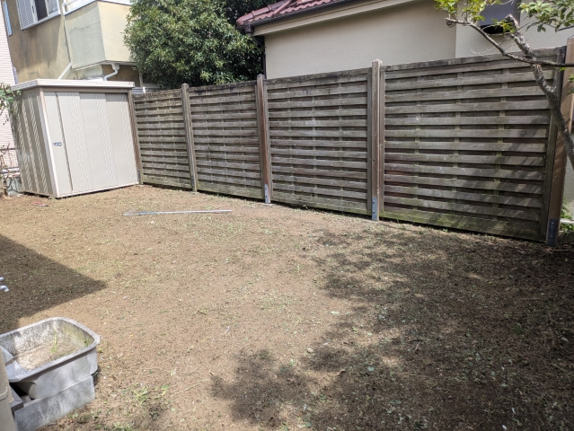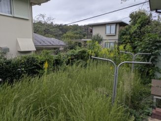 写真の通り、物置まわりや目隠しフェンス沿いは特に伸びが早く、足元が隠れるほどでした。