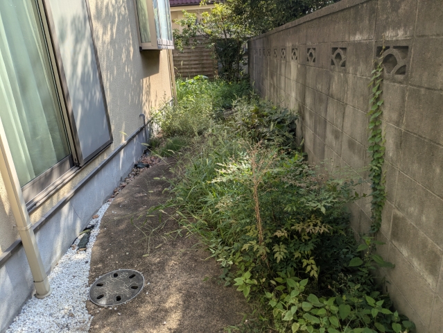 それともう一つ、見落としやすいのが建物脇の細い通路。ブロック塀沿いにツルや雑草が広がっていて、排水桝の点検もしづらい状態でした。