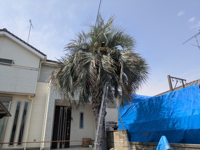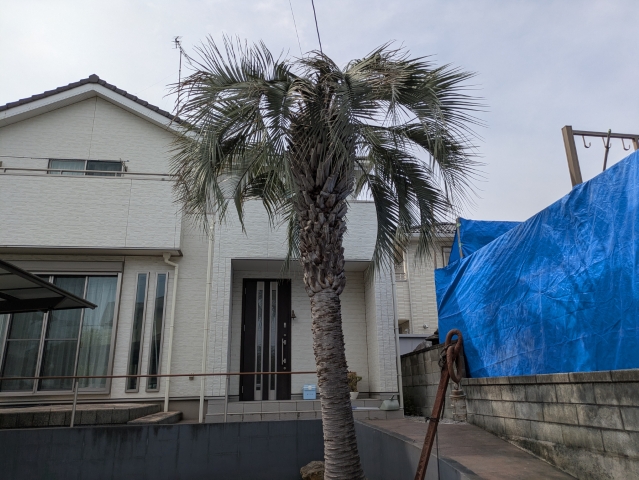 今回の対象は、存在感のある背の高いヤシの木。葉が四方に広がるタイプなので、見た目は南国らしくて魅力的なのですが、古い葉が残ったままだと風でバタつきやすく、落下や飛散が心配になります。玄関まわりと通路に近い位置だったこともあり、「通る時に当たりそう」「掃除が大変」といったお悩みもありました。